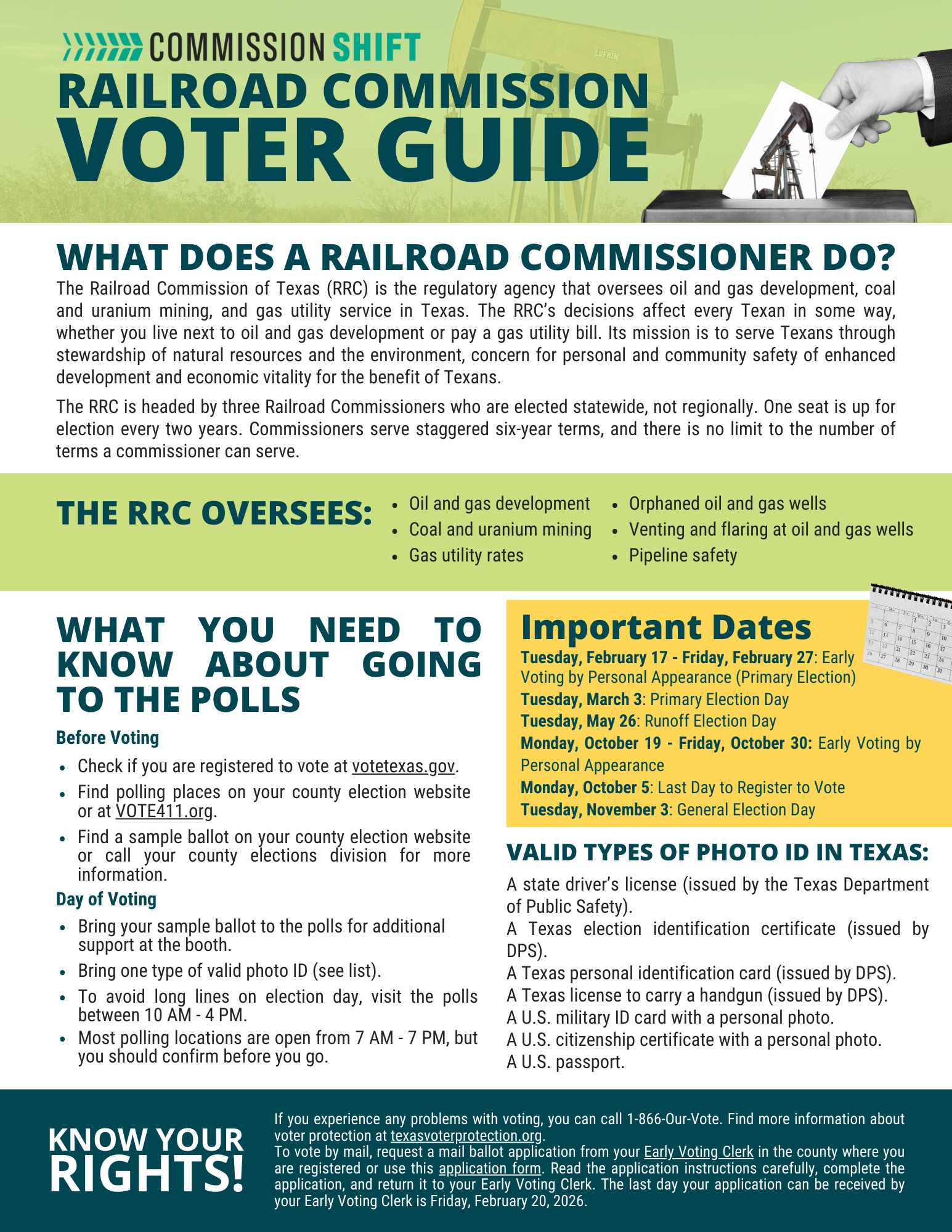 Learn more about the Railroad Commission and what you need to vote with our Voters Guide! The guide also comes with a worksheet you can use to reflect on how the candidates for Railroad Commissioner align with your values and your community needs.