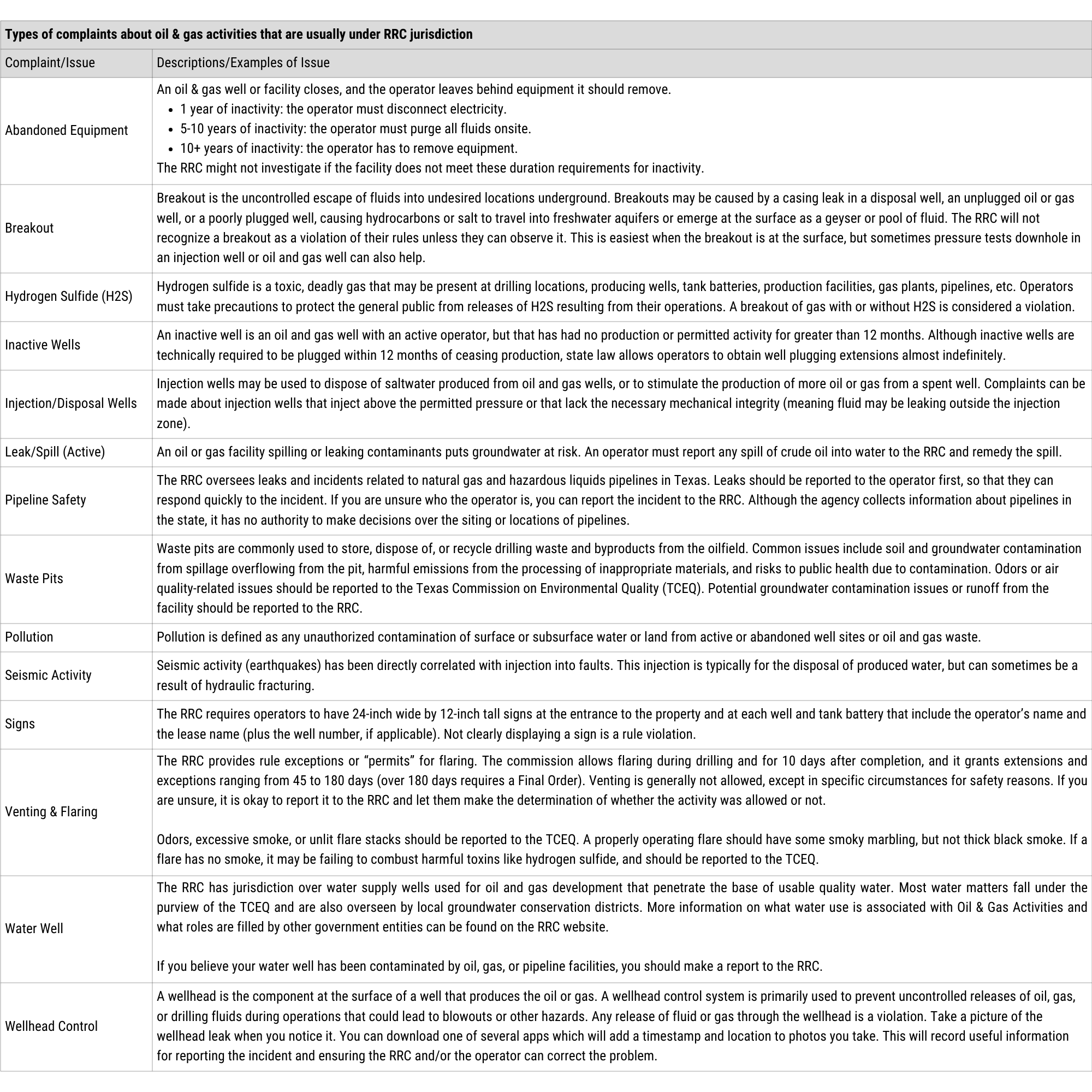 In order for the Railroad Commission (RRC), the state oil and gas oversight agency, to address your concern, it must fall within the agency’s authority. When it comes to oil and gas development, the RRC oversees activities related to the exploration and production, pipeline safety, underground injection of produced water or carbon dioxide, and surface disposal of oil and gas waste. The RRC also has authority over other types of mining, underground injection, and pipelines that will not be discussed in this guide.